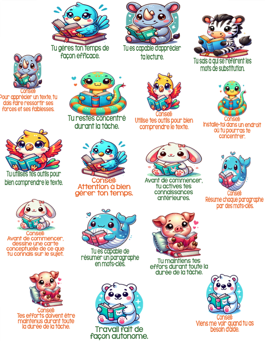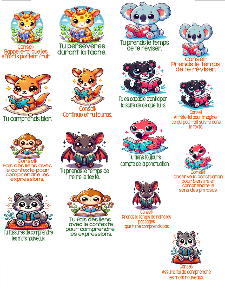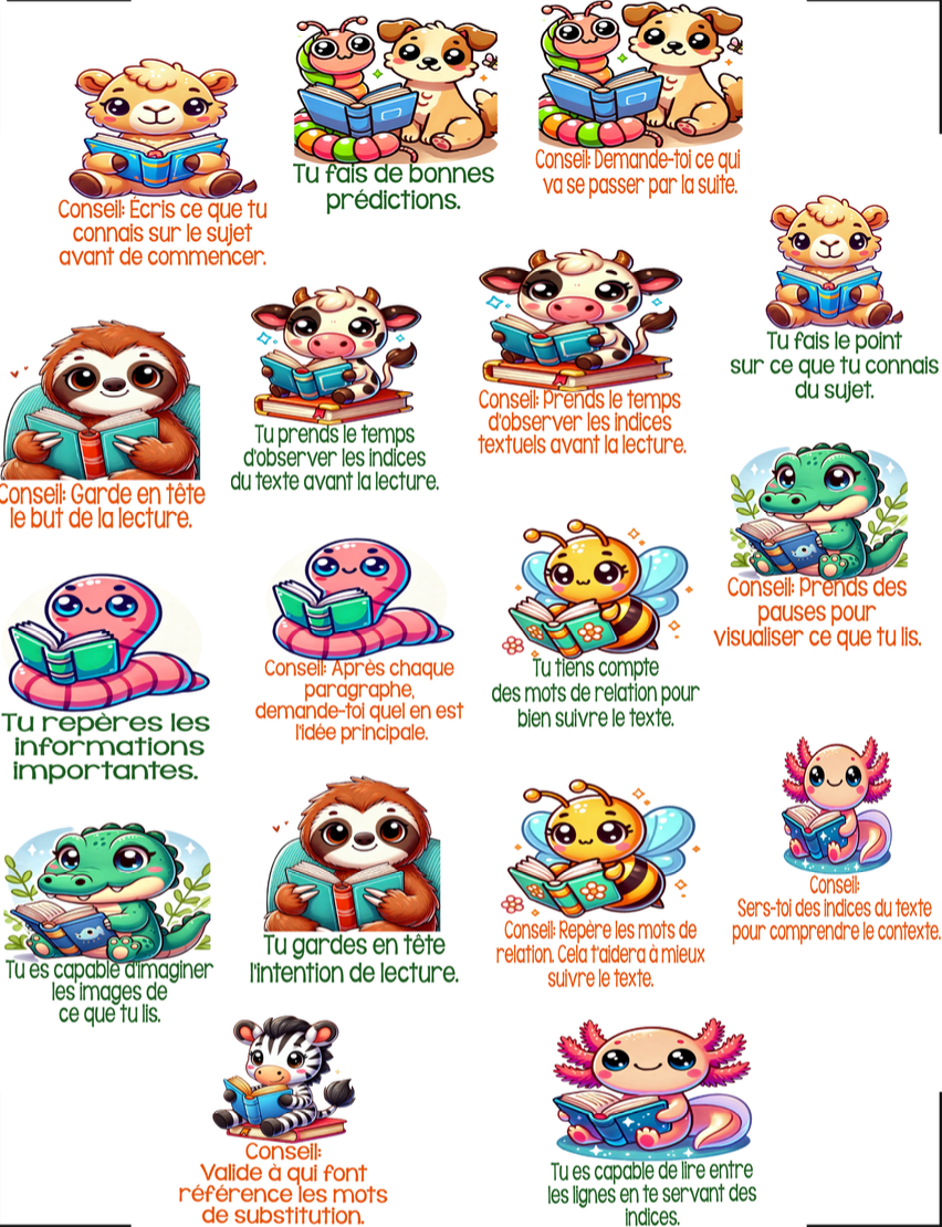 👉 Que vos élèves aient besoin de prévoir, faire des inférences, poser des questions ou résumer, chaque autocollant leur rappelle quoi faire et comment penser en lisant.