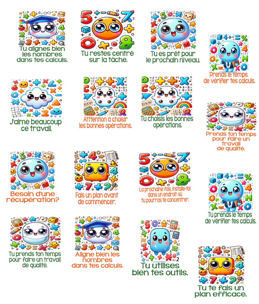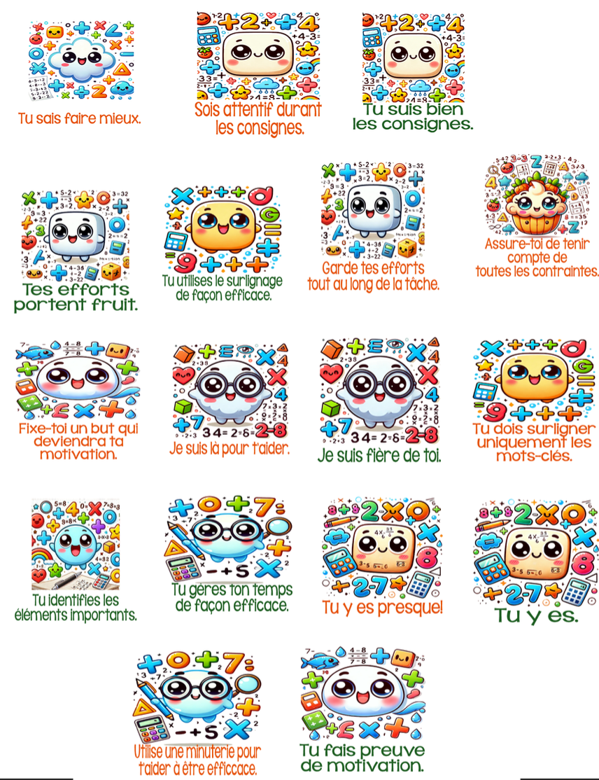 Conçus pour motiver, guider et outiller les élèves... tout en ajoutant une jolie touche à leurs cahiers de maths ou à leurs feuilles de travail!