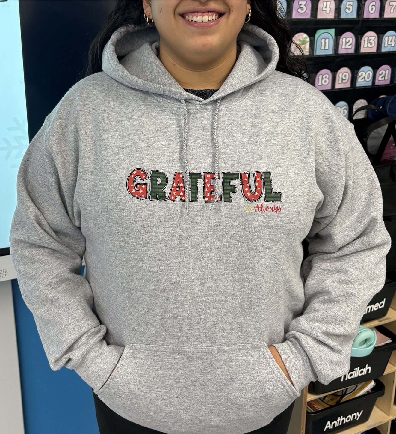 Restez au chaud tout en affichant votre reconnaissance avec ce magnifique chandail à capuchon « Grateful Always » — un essentiel de saison au style festif et moderne. Le message positif « Grateful Always » rayonne de gratitude toute l’année. 💫